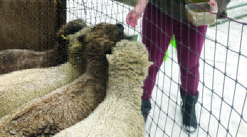 Karri Munn-Venn feeds her llama, housed with her F1 and F2 Valais Blacknose crossed with Scottish Blackface. The sheep are part of a breeding program.