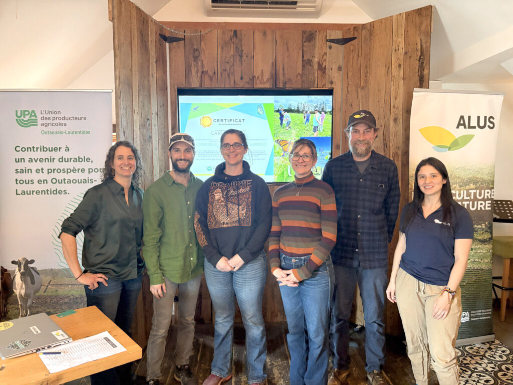 ALUS Outaouais celebrated its fifth anniversary at the Chelsea Pub last week, joined by participating farmers from across the region. From left are ALUS coordinator Maria Jose Maezo, Félix Meunier of Jardin des Draveurs Farm, Erin Krekoski of Rock’s End Farm, Kristine Amyotte of Beck Family Farm, Dave Reford of Reford Beef, and ALUS agri-environmental technician Camila Rubiano.