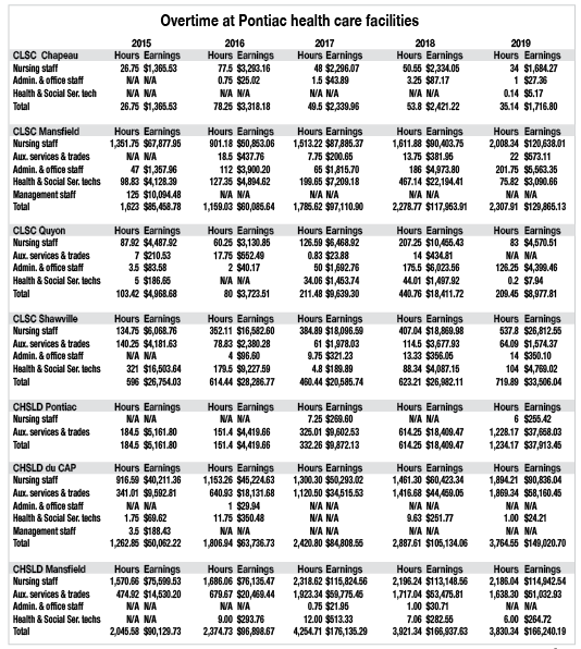At Chsld Pontiac, the overtime hours soared in recent years specifically in auxiliary services and trades, rising from just under 200 hours in 2015 to more than 1,200 in 2019, at a cost of just over $37,000.