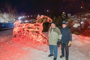 Winterlude celebrations run from Feb. 2 through Feb. 19, just around the corner from the Rideau Centre and across from city hall in downtown Ottawa. From left: Dr. Roly Armitage and Bill Galvin pose with the carving as it’s lit up at night.