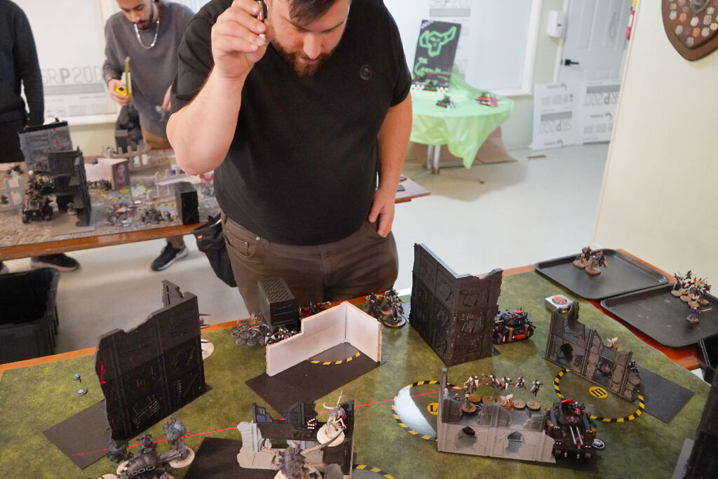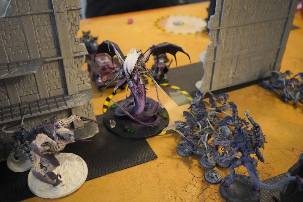 Off the hop, he threw me entirely for a loop, as much of the Tyranid battle plan revolves around using a game mechanic called battle shock, a kind of morale test. My alien hivemind is able to psychically terrorize most of my weaker opponents you see, and if they don’t roll well, they lose their ability to capture objectives and receive buffs. As Mike explained, the daemons have their own psychic aura that mostly cancels this out, and even allows them to heal if they pass the test, which is quite effective with big monsters.