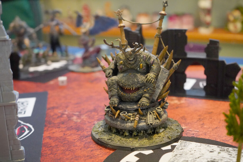 His army, the Chaos Daemons, was very different from anything I’d played against before, as it consisted of a small number of large, tanky monsters with powerful abilities. The daemons look about as grotesque as they sound, with one morbidly obese ogre that Mike nicknamed Big Chungus standing out as particularly gnarly (see photo).