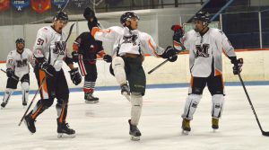 The Maniwaki Mustangs were the home team as they took on the Grey Highlands Hawks Saturday night in Canadian Premier Junior Hockey League action at the Shawville arena. From left: Samuel Constantineau, Leon Wiskeychan, Kevin Flamand and Dylan Dugas celebrate a goal.