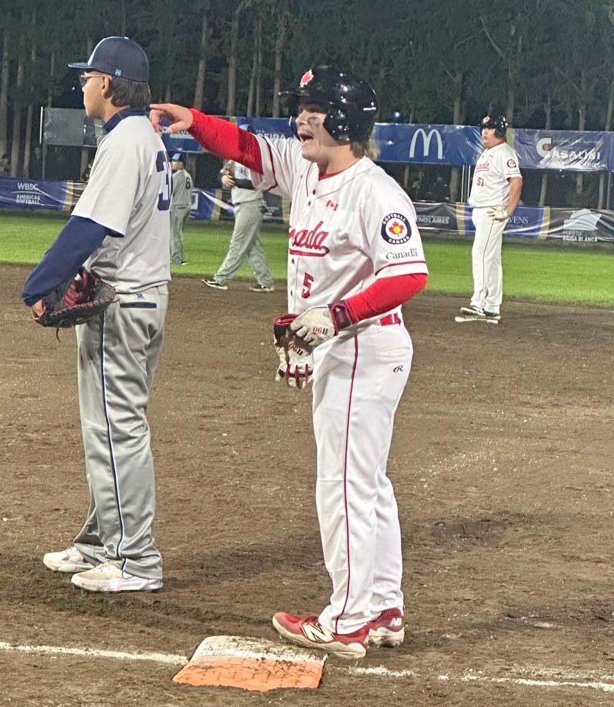 Cade Kuehl and Team Canada descended on Bahia Blanca, Argentina for the Pan Am softball championships in early October. Here, he is pictured in pre-tournament play after getting to first base. Photo: Submitted by Cade Kuehl
