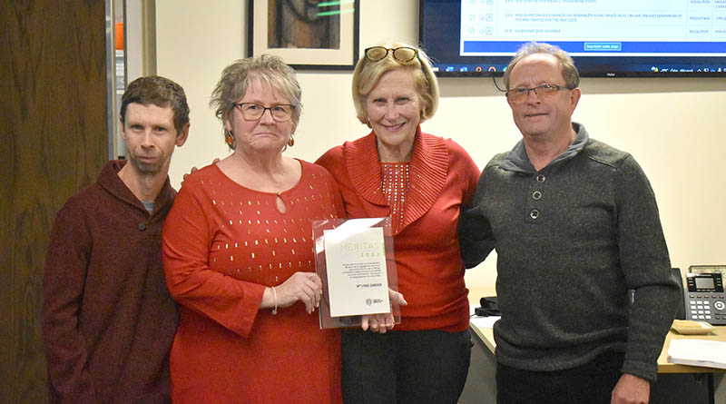 Mayor of Portage-du-Fort Lynne Cameron with her son Jeffrey and her husband Ron pose for a picture with Warden Jane Toller. During the MRC meeting, a ceremony was held for Cameron, which conferred a plaque from Fédération québécoise des municipalités for 20 years service as mayor. Cameron received a standing ovation from her fellow mayors.