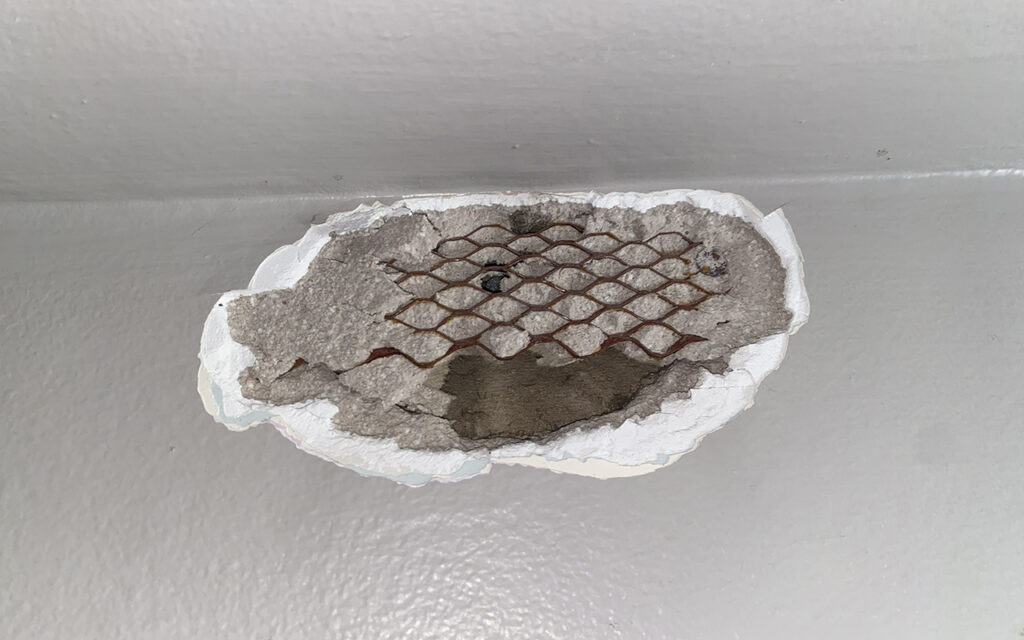Closer inspection revealed a large hole had been blasted out of the plaster in the wall behind the lamp, revealing the steel mesh that supported it.
