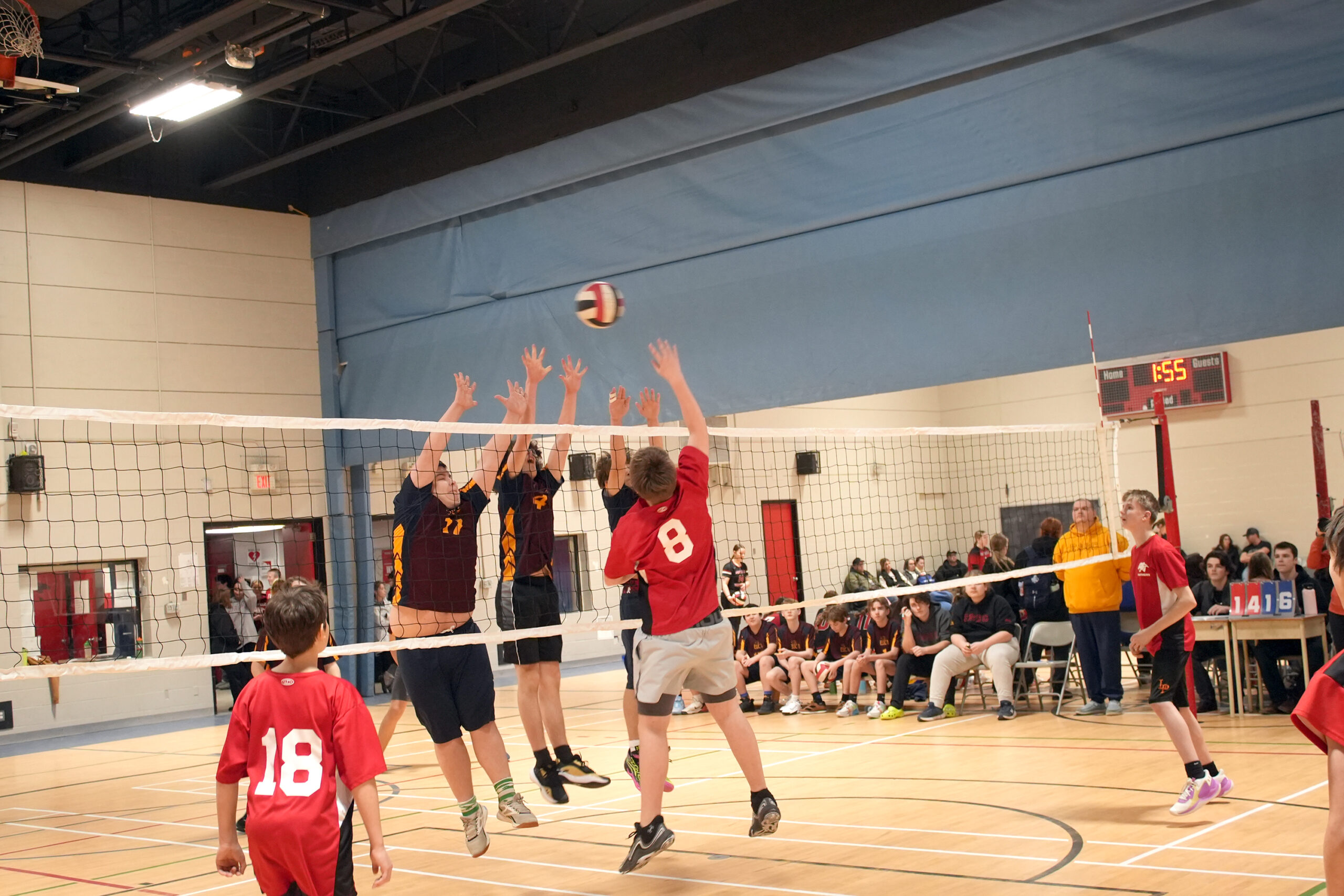 PHS player Logan Thompson lands a shot over the hands of three ESSC blockers.