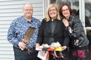 Guests travelled in from across the area church of Renfrew-Pontiac and beyond to wish her well in retirement. From left: Garry Belair, a.k.a. Chief White Owl, the Venerable Mavis Brownlee, and Lisa Beausoleil display the gifts of a smudging bowl, feather, Thunder Hawk pendant and mixture of sage, tobacco and sweet grass, gifted from the Algonquin Pontiac Outaouais Tribe.