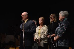 From left: Peter Morrison shares a performance review of Brownlee’s from a few years back, while Bob Bretzlaff, Doris Beck, Brownlee and Hilary Rathwell wait for their turn at the mic.