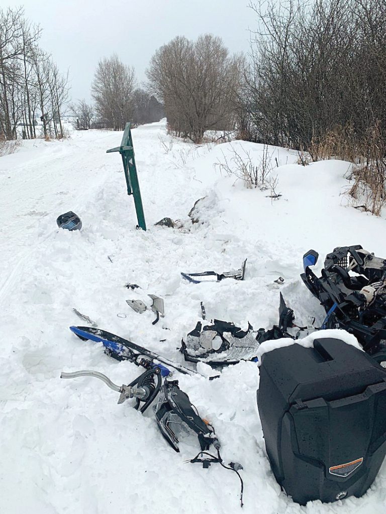 A snowmobiler was injured and his sled totalled after he struck a gate along the PPJ trail in Clarendon on Feb. 23.