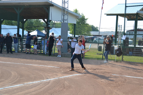 Pontiac MNA André Fortin kicked off the Mansfield Canada Day Celebrations on Friday by batting a few pitches served up by MP Will Amos. Though the first couple went astray, Fortin managed to connect his bat with one eventually, knocking out a line drive to right field.