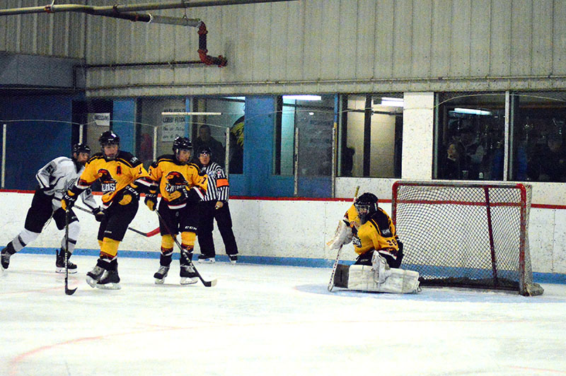 Connor Gilpin catches the goalie by surprise with a shot on goal from centre during a 3-1 Midget A Lions win on Saturday afternoon.