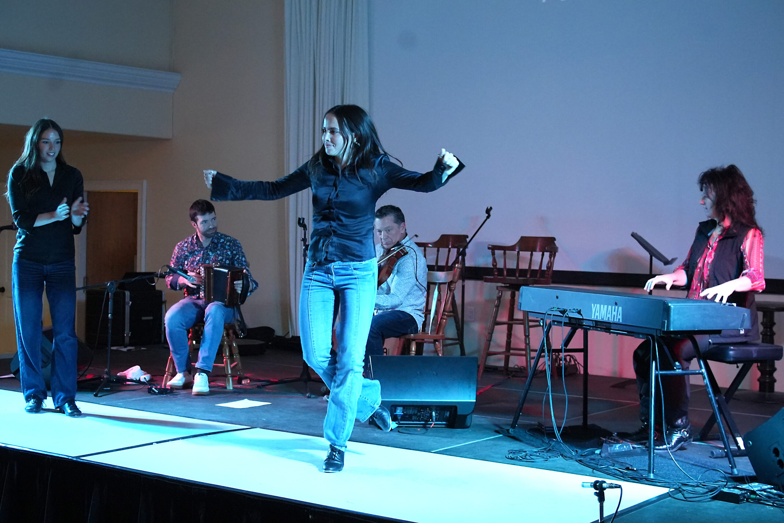 Dancers Hannah Donohue (centre) and Aliyah Leahy (left) kept the crowd entertained, backed up by the musical stylings of back row, from left, Timi Turmel, Louis Schryer and Erin Leahy.