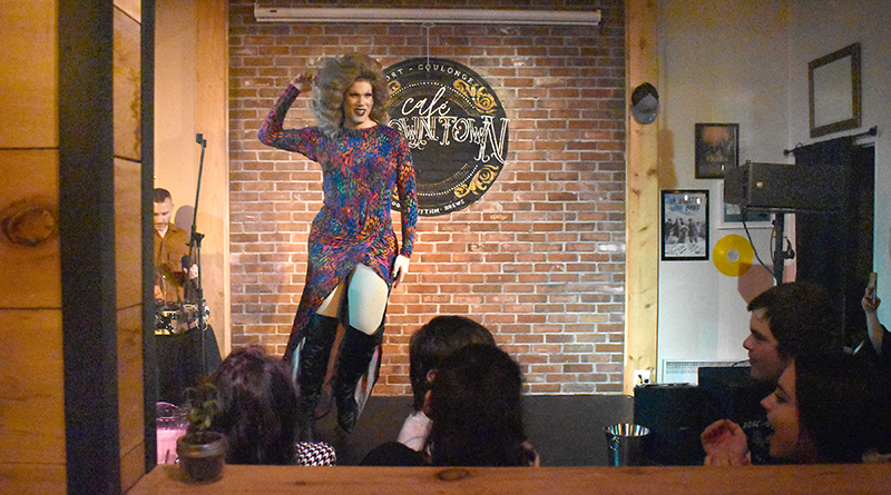 Alexandre Romain and Natasha Lamadeleine, the new owners of the Café Downtown, Matthew Armour (AKA Matty Longlegs), the organizer and lead performer at the drag show, Martin Leguerrier, the events DJ, and Kim Laroche and Manon Gervais of Bouffe Pontiac.