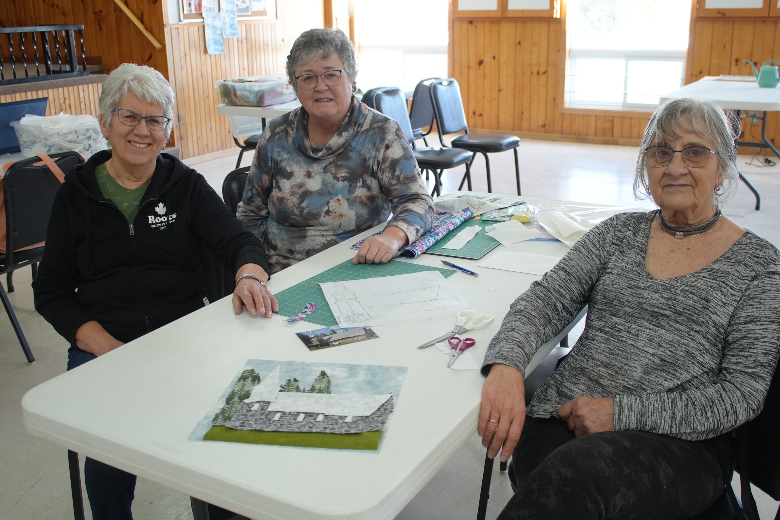 A group of crafters are celebrating Otter Lake’s 150th anniversary celebrations with a community wall-hanging which will be installed at the town hall in September. From left, Beverly Kluke, Donna Cushman and Phyllis Dubeau, pose with a square dedicated to St. James Anglican Church. Photo: Caleb Nickerson.