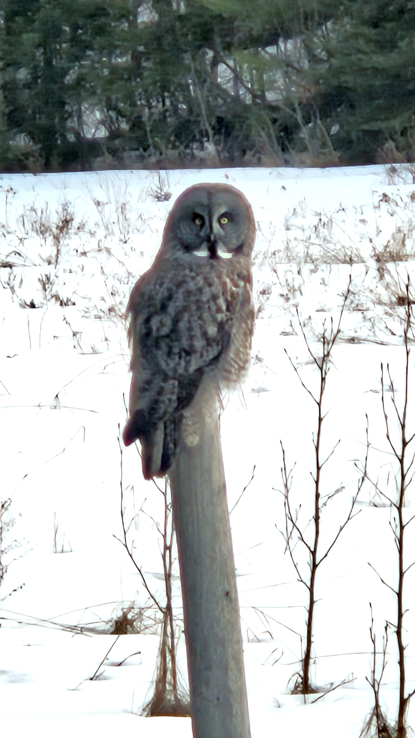 Great Grey Owl on the drive home on L’Ile-du-Grand-Calumet