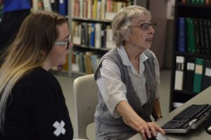 After the introduction, Crawford and two other volunteers, Dorcas Sparling and Barbara Haughton, assisted the students with finding the materials they would need, as well as how to search for the information electronically.