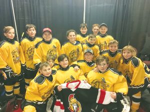 On Nov. 16 the Pontiac Lions Atom A played an exhibition game at the Canadian Tire Centre. The team was excited to play on the same ice as the Ottawa Senators. They won 3-2 against Loups des Collines. Paige Dubeau, Liam Quaele and Gavin Rusenstrom were the goal scorers of the afternoon. The kids had lots of fun and each received a Senators practice jersey. The team attended the Senators vs. Pittsburgh Penguins game that evening. Back from left: Noah Oliveira, Andrew Kavanagh, Cade Kuehl, Hannah Twolan, Matthew Kavanagh, Grayson Kilroy, James Twolan and Will O’Malley. Front from left: Garrett Rusenstrom, Vincent Gilbert, Bennett Rusenstrom, Liam Queale, Jaxson Armstrong, Gavin Rusenstrom and Paige Dubeau.