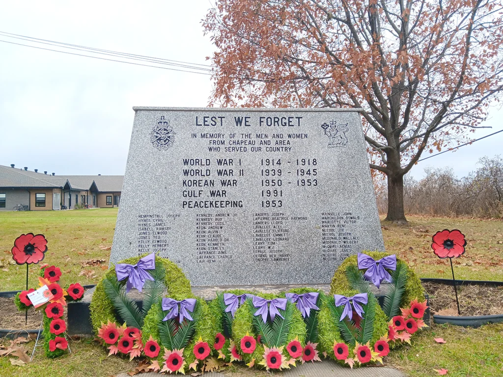 Seven wreaths were laid against the cenotaph on St-Jacques Street during the Remembrance Day ceremony in Chapeau on Sunday morning. The war memorial pays tribute to the dozens of men and women from the Chapeau area who served in WWI, WWII, the Korean War, and the Gulf War. The Chapeau ceremony was one of five organized by the Pontiac. Photo: Leiya Fischer