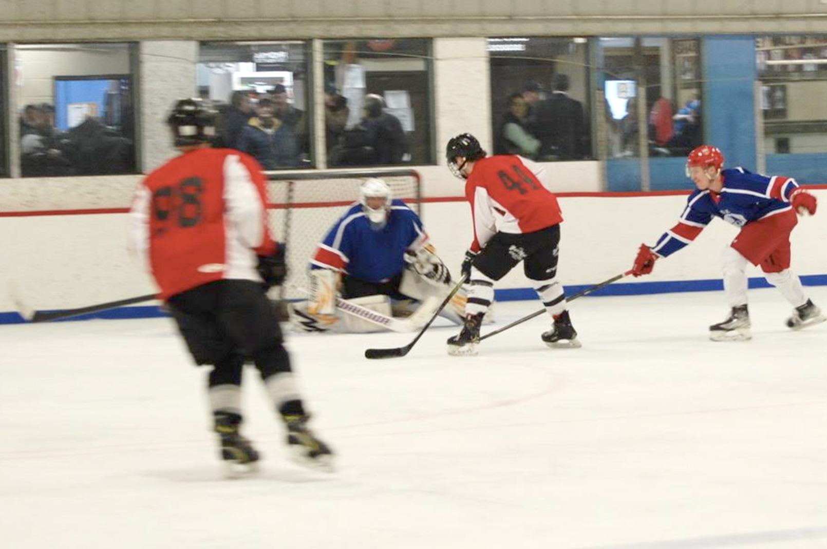 Bandits player Matthew Favereau attempts to deflect a shot from a North Clarendon player during the 26th annual Flying Elbows hockey tournament, which took place at the Shawville arena over four days last week. Photo: Sarah Pledge Dickson