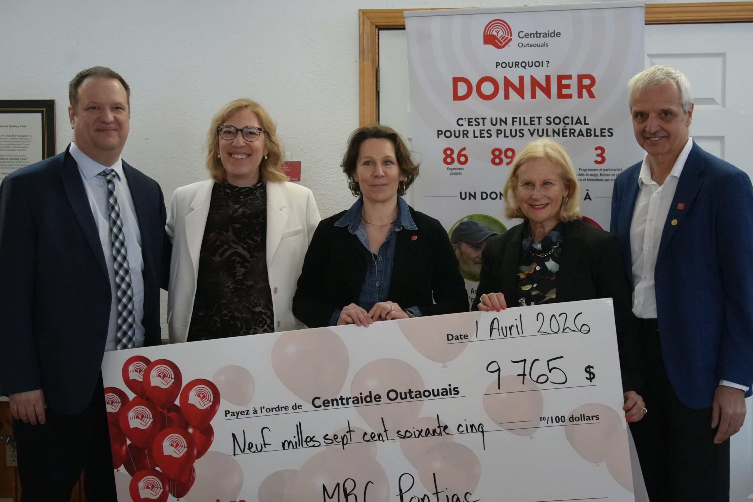 Pontiac warden Jane Toller presented a cheque for $9,765 to Centraide Outaouais’ 2025/26 campaign president Daniel Morneau, which she said was the largest amount raised by the MRC to date. She gave a special mention to outgoing MRC communications director Francis Beausoleil for his hard work collecting donations for the campaign.