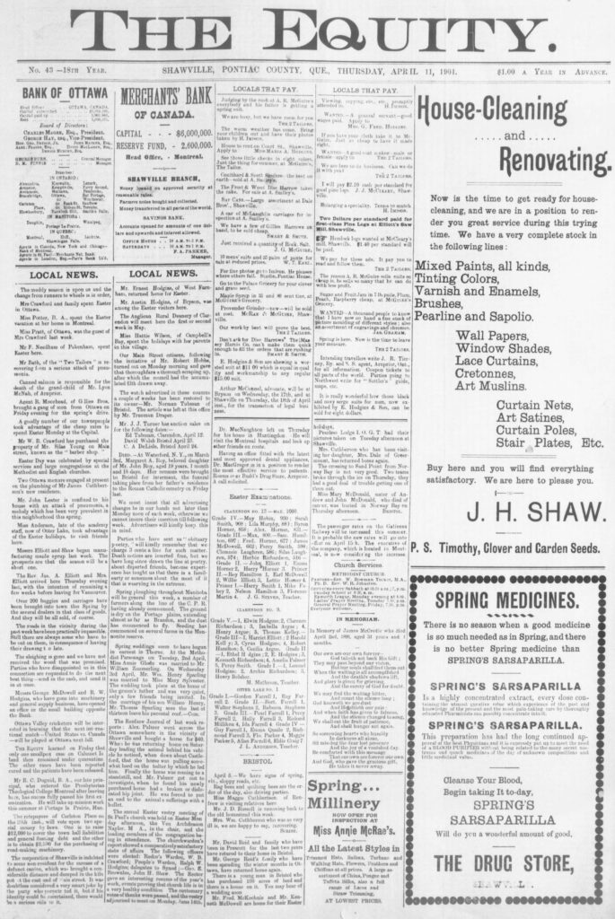 The corporation of Shawville is indebted to some non-resident for the carcass of a defunct canine, which was brought a considerable distance and dumped in the kiln pot at the east end of Main street. It was doubtless considered a very smart joke by the party who perpetrated it, but if his identity could be ascertained, there would be a serious side to it.