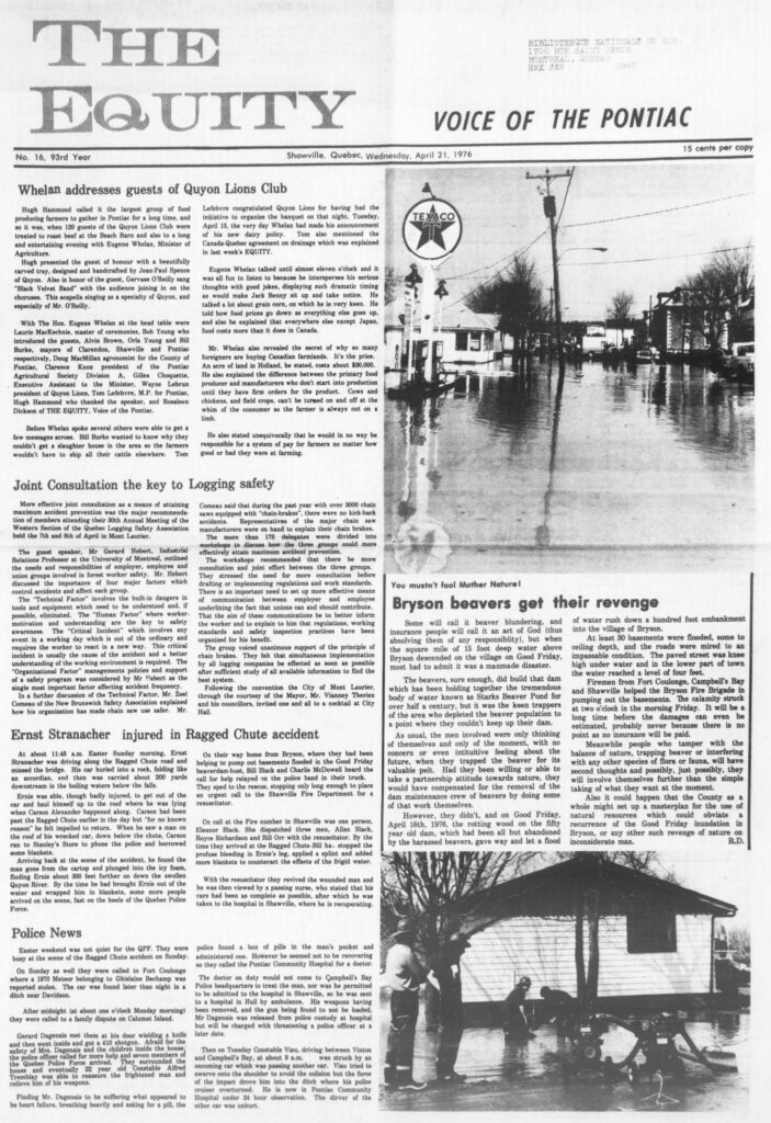 Before Whelan spoke several others were able to get a few messages across. Bill Burke wanted to know why they couldn’t get a slaughter house in the area so the farmers wouldn’t have to ship all their cattle elsewhere. Tom Lefebvre congratulated Quyon Lions for having had the initiative to organize the banquet on that night, Tuesday, April 13, the very day Whelan had made his announcement of his new dairy policy.
