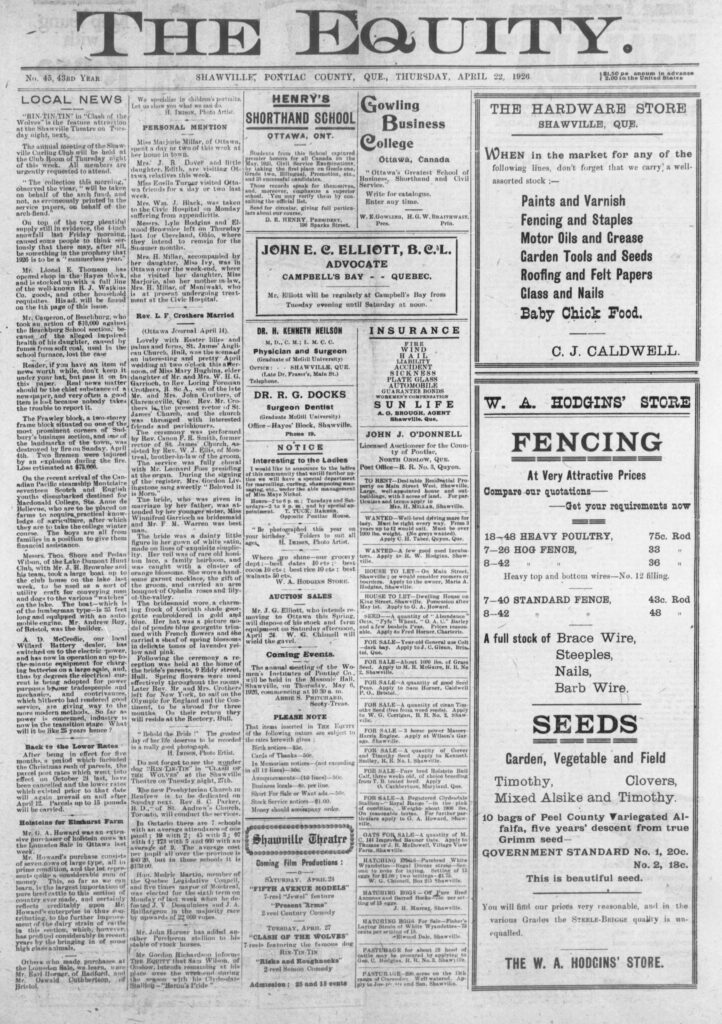 Local news: “RIN-TIN-TIN” in “Clash of the Wolves” is the feature attraction at the Shawville Theatre on Tuesday night, next.