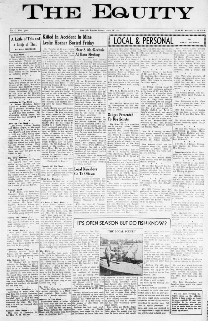 Local newsboys go to Ottawa: Five district newspaper carrier boys went to Ottawa last Saturday for a two-day, all expenses paid holiday. The Ottawa Journal, for whom the boys deliver, footed the bill. From this area went Donnie Burton and Bev Garrison, of Shawville; Jerome Devlin, of Campbell’s Bay; Charles Chevrier, of Quyon and Howard Weedmark, of Beechburg.