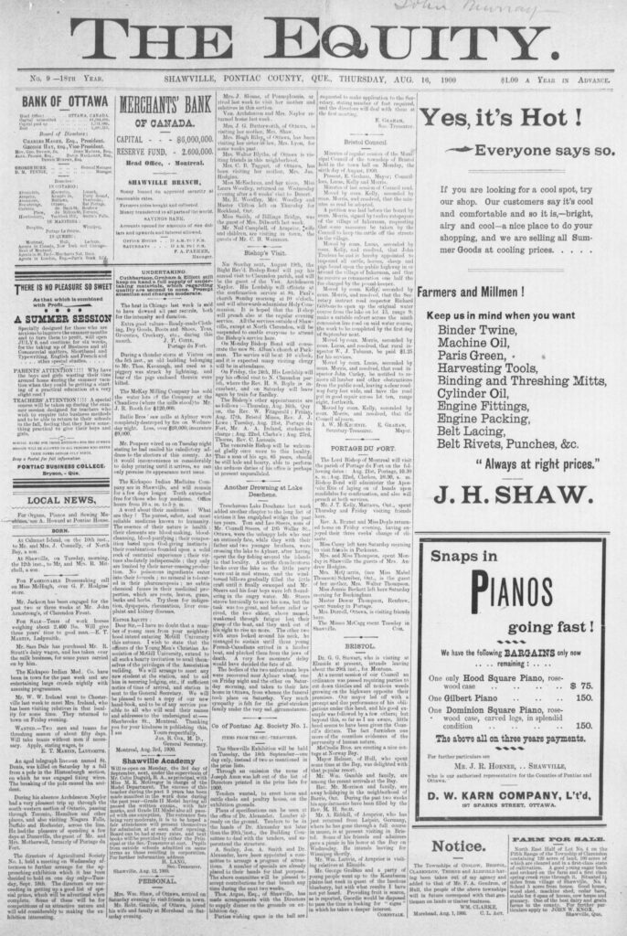 Treacherous Lake Deschene last week added another chapter to the long list of victims it has engulfed within the past ten years. Tom and Leo Steers, sons of Mr. Connell Steers of Ottawa, were the young lads who met an untimely fate, while they with their father and two younger brothers, were crossing to Aylmer, after having spent the day fishing around the islands in that locality. A terrific thunderstorm broke over the lake as the little party were out in mid stream and the wind-tossed billows gradually filled the little craft until it finally swamped and Mr. Steers and his four boys were left floundering in the angry water. Mr. Steers strove heroically to save his sons, but the task was too great and the two eldest, weakened through fatigue, lost their grasp of the boat and sank out of his sight. The other two with arms locked around his neck, he managed to sustain until three young French-Canadians arrived in a lumber boat and plucked them from the jaws of death. The bodies of the two unfortunate boys were recovered near Aylmer Wharf. Very much sympathy is felt for the grief-stricken family under the very sad circumstances.
