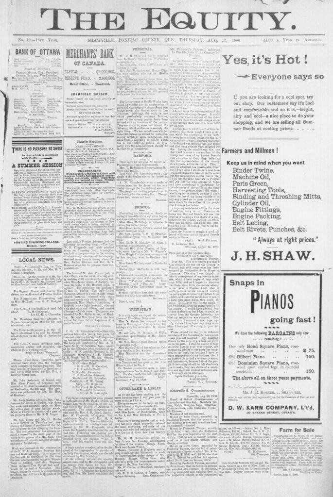 The Dolan (mill) property in Shawville is advertised to be sold by Sheriff’s sale at Bryson on the 5 September next.