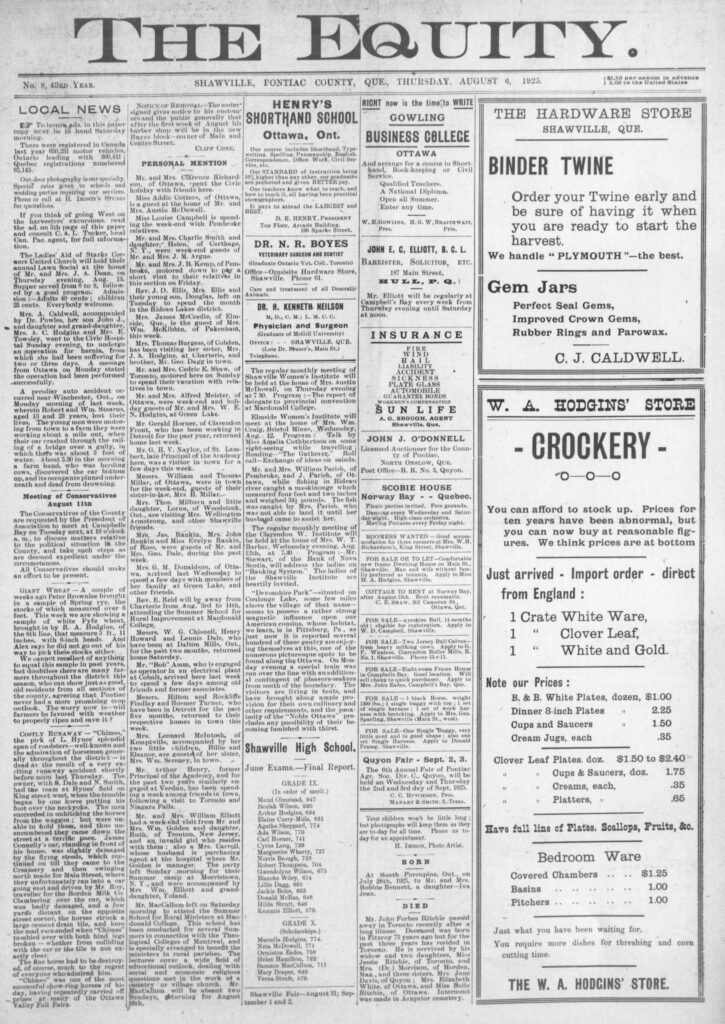 Mrs. A. Caldwell, accompanied by Dr. Powles, her son John J. and daughter and granddaughter went to the Civic Hospital Sunday evening to undergo an operation for hernia, from which she had been suffering for two or three days. A message from Ottawa on Monday stated the operation had been performed successfully.
