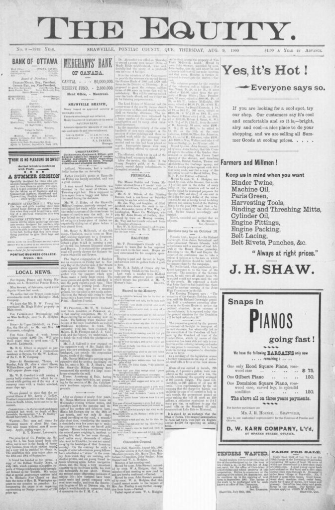 Messrs. Armstrong and Dale, having just burnt a large brick kiln, are preparing for the erection of Mr. Jas. Cuthbertson’s residence opposite the exhibition grounds in Shawville.