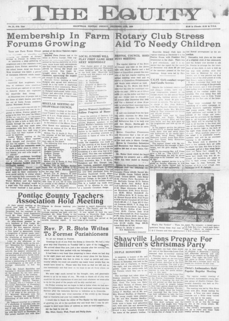 Local News: Despite the inclement weather and slippery streets, there was a large congregation present in the United Church for the annual Vesper and candle-lighting service of the C.G.I.T. girls. 30 girls were in costume. Scriptures were read by Janey McDowell and Evelyn Warford, poems by Lorraine Elliot and Barbara Smith and four girls gave out the programmes and took up the offering. In the pageant service, the purpose of the C.G.I.T. to cherish health, seek truth, know God and serve others was emphasized by candle lighters, these being Nancy Hodgins, Rosemary Lunam, Anna Faye Stickler, Joan Smart, Betty Richardson and Norma Paul.