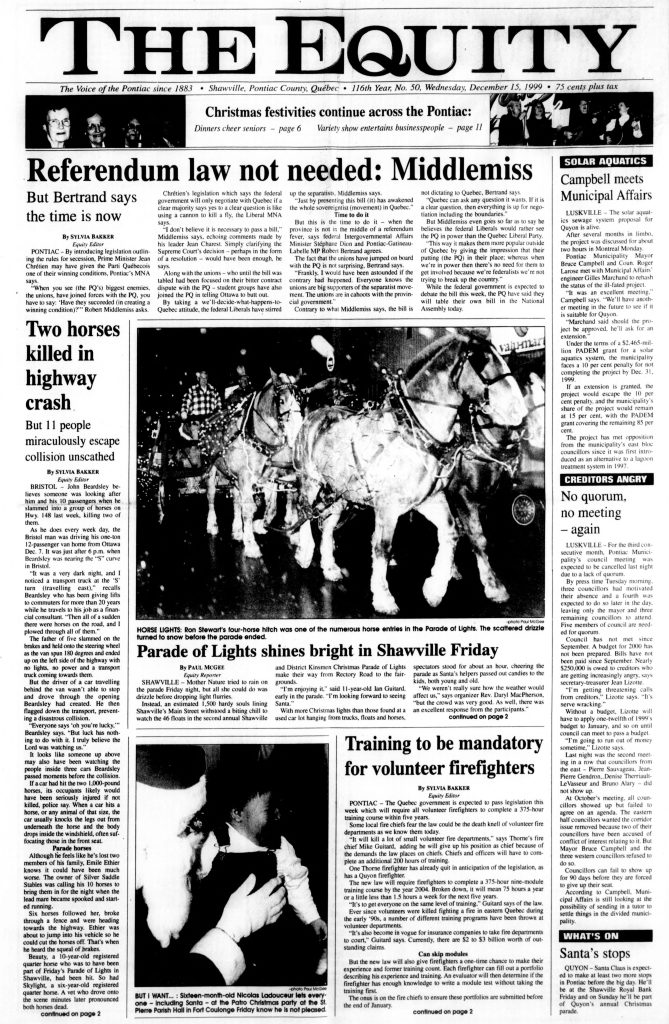 Parade of Lights shines bright in Shawville Friday: An estimated 1,500 hardy souls lining Shawville’s Main Street withstood a biting chill to watch the 46 floats in the second annual Shawville and District Kinsmen Christmas Parade of Lights make their way from Rectory Road to the fairgrounds.