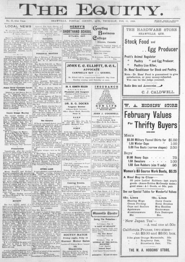 County Orange meeting: The annual meeting of the County Orange Lodge, for the election of officers and other business, was held in Shawville Orange Hall on Thursday last, Rev. T. W. Ball, retiring Co. Master, presiding. There was a fairly good representative attendance.