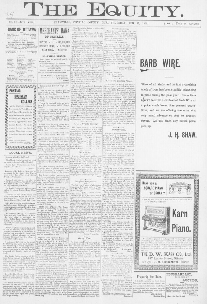 The Bryson Advocate in mentioning the receipt by Mr. Wm. G. LeRoy of that town, of one of the medals awarded to those who served during the Fenian raids of 1866; says Mr. LeRoy “is the sole representative in Pontiac of the gallant defenders of the country at that time.” We might add that among those who were called out during the latter invasion of the same organization, was Mr. T.W. Boyle of Shawville, and Mr. Duncan Ross, postmaster of Upper Thorne Centre. Mr. Boyle’s services have also been recognized by the receipt of a medal, and we believe Mr. Ross has received one as well.