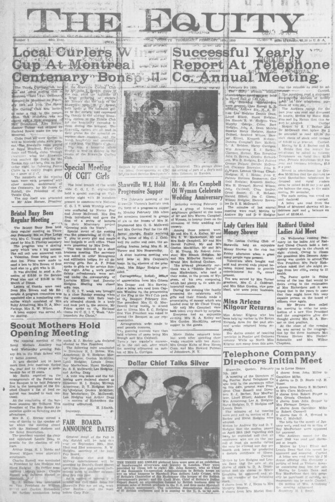 Local News: The Thistle Curling Club, largest and oldest curling club in Montreal, held its Centenary Bonspiel in Montreal on Feb. 10 and 11. The Shawville Curling Club was invited to enter a rink in this competition.