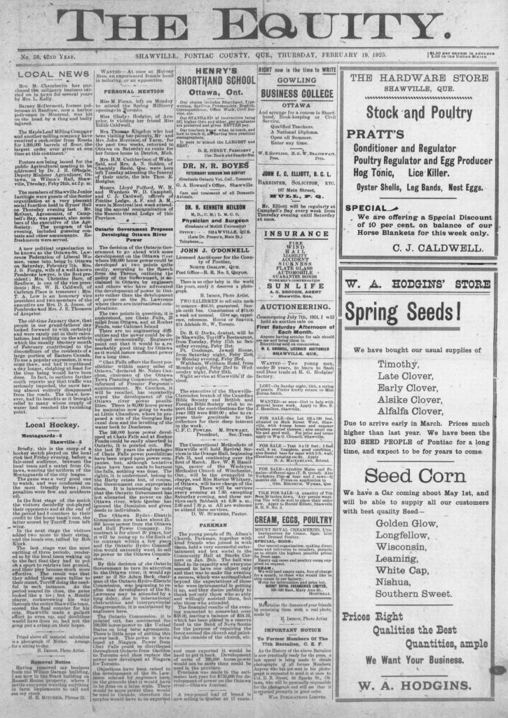 Local News: The old-time January thaw that people in our grandfathers’ day looked forward to with certainty and were rarely out in their calculations, had nothing on the article which the usually blustery month of February contributed to the discomfiture of the residents of a large portion of Eastern Canada. To use a popular expression, it was some thaw and had it continued a day longer, sleighing at least for the time being, would have been done. In fact, in sections further south, reports say that traffic was seriously impeded, the snow having almost entirely disappeared from the roads.