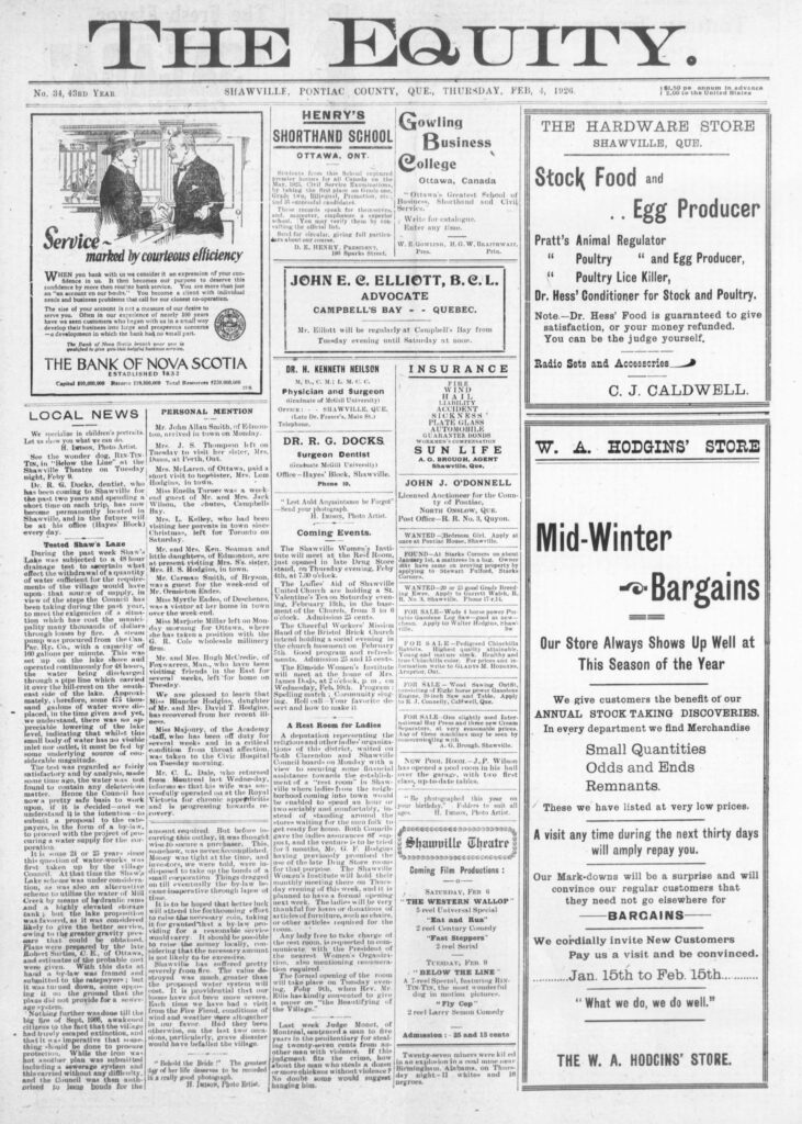 A Rest Room for Ladies: A deputation representing the religious and other ladies’ organizations of this district, waited on both Clarendon and Shawville Council boards on Monday with a view to securing some financial assistance towards the establishment of a “rest room” in Shawville where ladies from the neighborhood coming into town would be enabled to spend an hour or two sociably and comfortably, instead of standing around the stores waiting for the men folk to get ready for home. Both Councils gave the ladies assurances of support, and the venture is to be tried for 3 months, Mr. G. F. Hodgins having previously promised the use of the late Drug Store rooms for that purpose.