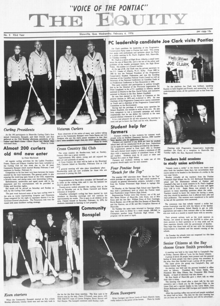 PC leadership candidate visits Pontiac: Joe Clark candidate for leadership of the Progressive Conservative Party came to Pontiac last week. This young man spoke with enthusiasm and optimism about his Party at a public meeting in St. Paul’s Anglican Hall, Shawville, on Tuesday evening.