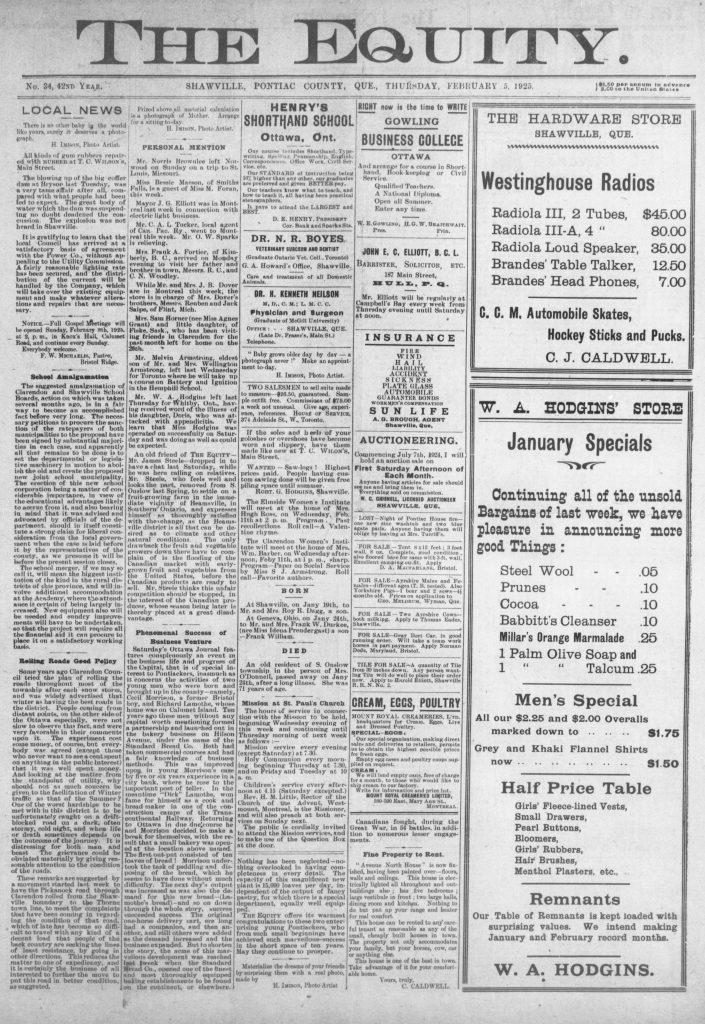 Local News: Saturday’s Ottawa Journal features conspicuously, an event in the business life and progress of the capital that is of special interest to Pontiackers, inasmuch as it concerns the activities of two young men who were born and brought up in the county, namely, Cecil Morrison, a former Bristol boy, and Richard Lamothe, whose home was on Calumet Island. Ten years ago, these men without any capital worth mentioning, formed a partnership and launched out in the bakery business on Hilson Avenue under the name of the Standard Bread Co. Last week, the Standard Bread Co. opened one of the finest and most thoroughly equipped baking establishments to be found on the continent, or elsewhere. These two enterprising young Pontiackers, who from such small beginnings, have achieved such marvelous success in the short space of 10 years.