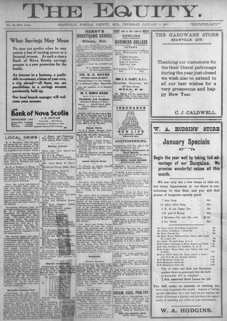 Local News: Don’t forget to visit the Orange Hall at supper time on New Year’s night and after you have satisfied the cravings of the inner man, walk over to Wilson’s Hall and enjoy the pictures.