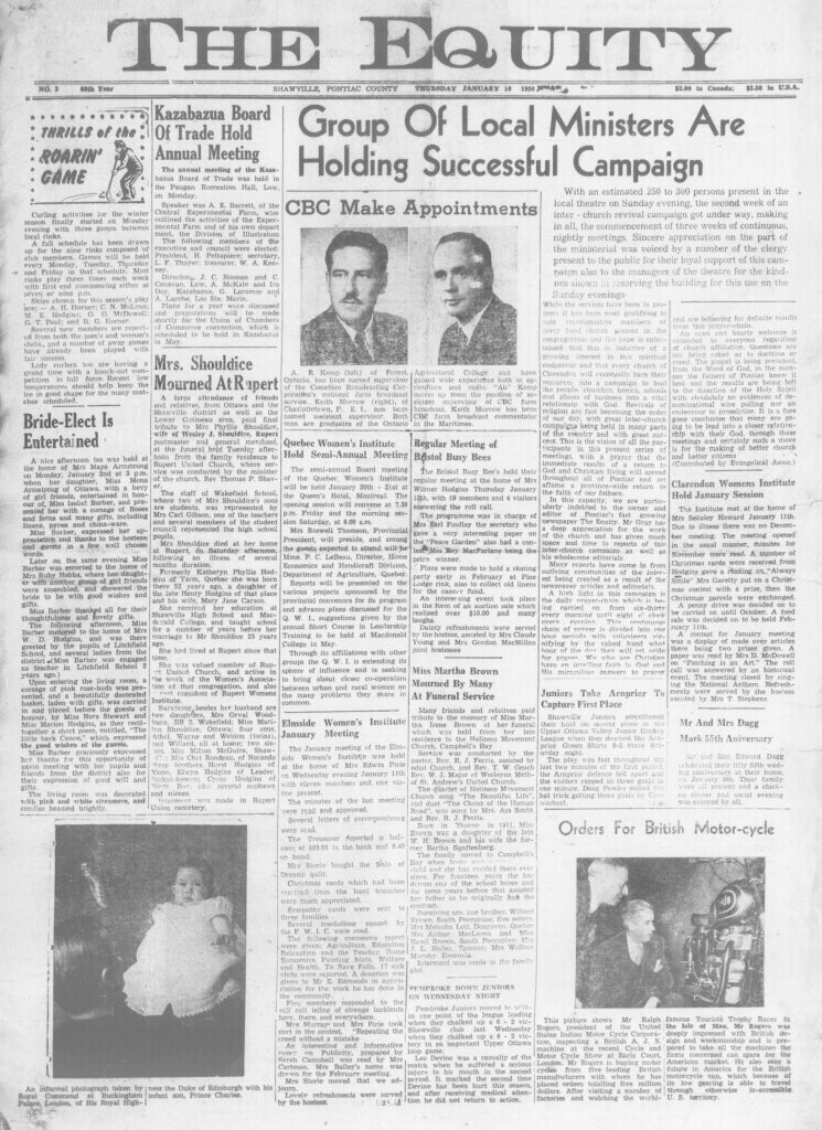 The Bristol Busy Bees held their regular meeting at the home of Mrs. Wilmer Hodgins on Thursday, with 19 members and 4 visitors answering the roll call. The programme was in charge of Mrs. Earl Findlay, the secretary who gave a very interesting paper on the “Peace Garden”, also had a contest, Mrs. Roy MacFarlane being the prize winner.