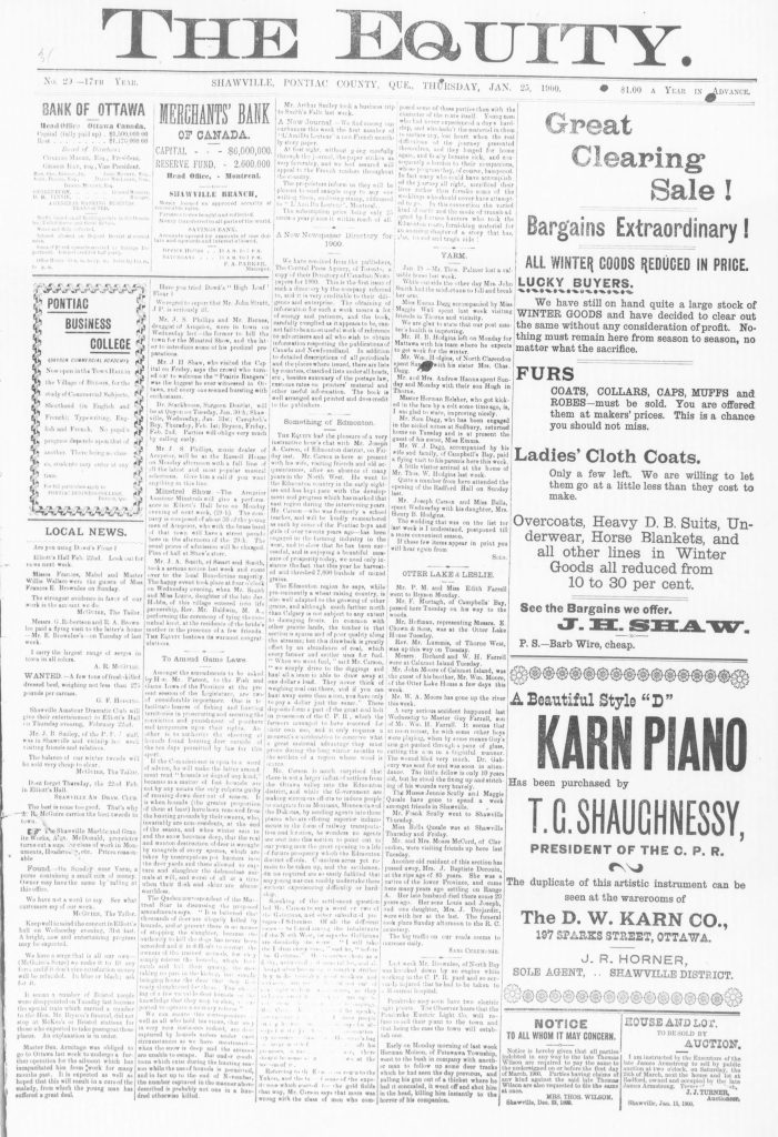 Ad: Great Clearing Sale! Bargains extraordinary! Lucky buyers. We have still on hand quite a large stock of winter goods and have decided to clear out the same without any consideration of profit. Furs, coats, collars, caps, muffs and robes must be sold. Overcoats, heavy D.B. suits, underwear, horse blankets and all other lines in winter goods all reduced from 10 to 30 per cent. See the bargains we offer. J.H. Shaw. P.S. Barb wire, cheap.