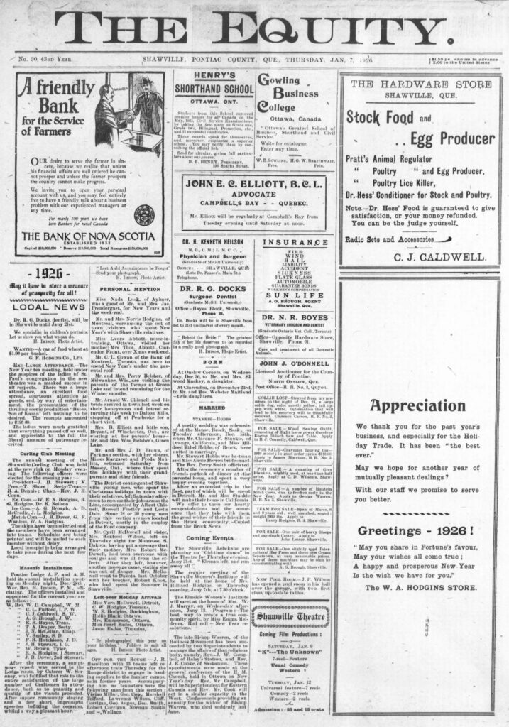 Local news: The Detroit contingent of Shawville young men, who spent the Christmas holidays in town with their relatives, left Saturday afternoon to return their jobs across the Line, accompanied by Albert Chisnell, Russell Findlay and Leslie Dale. Some 18 or 20 young men from this section are now located in Detroit, mostly in the employ of the Ford company.