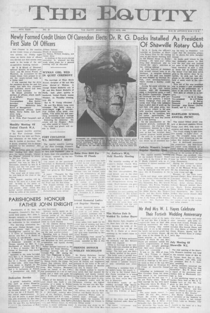 Local News: Dr. R.G. Docks was installed as president of Shawville Rotary Club for the coming year at the regular meeting held in the Pontiac House on Friday evening. He takes over the office from Neil Drummond who reviewed the year’s activities in his retiring address.