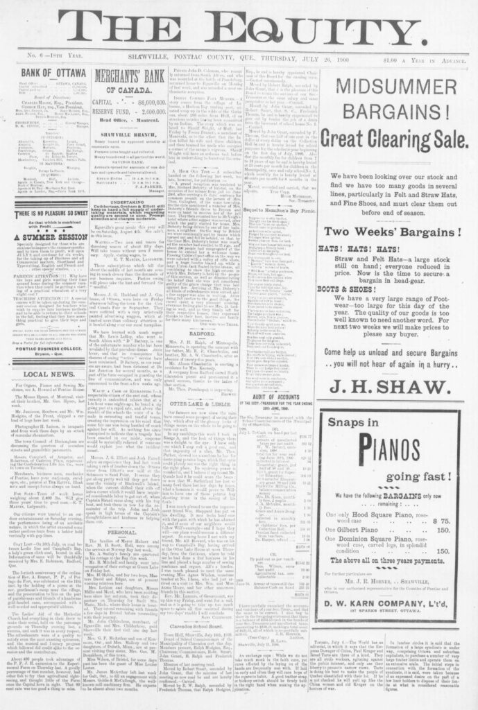 Messrs. J.G. Elliott and Josh Farrell relate an experience they had last week taking a crib of lumber down the Ottawa River from Elliott’s saw mill at the Schneaux to Sand Point. It seems they got along pretty well till they got down near the vicinity of Blackwell’s Island, when the current shifted their crib off into a corner which it would have required considerable labour to get out of, when Captain Ricard came along with his tug boat and took them in tow for the remainder of the trip. John and Josh speak in high terms of the Captain’s thoughtfulness and kindness in helping them out.