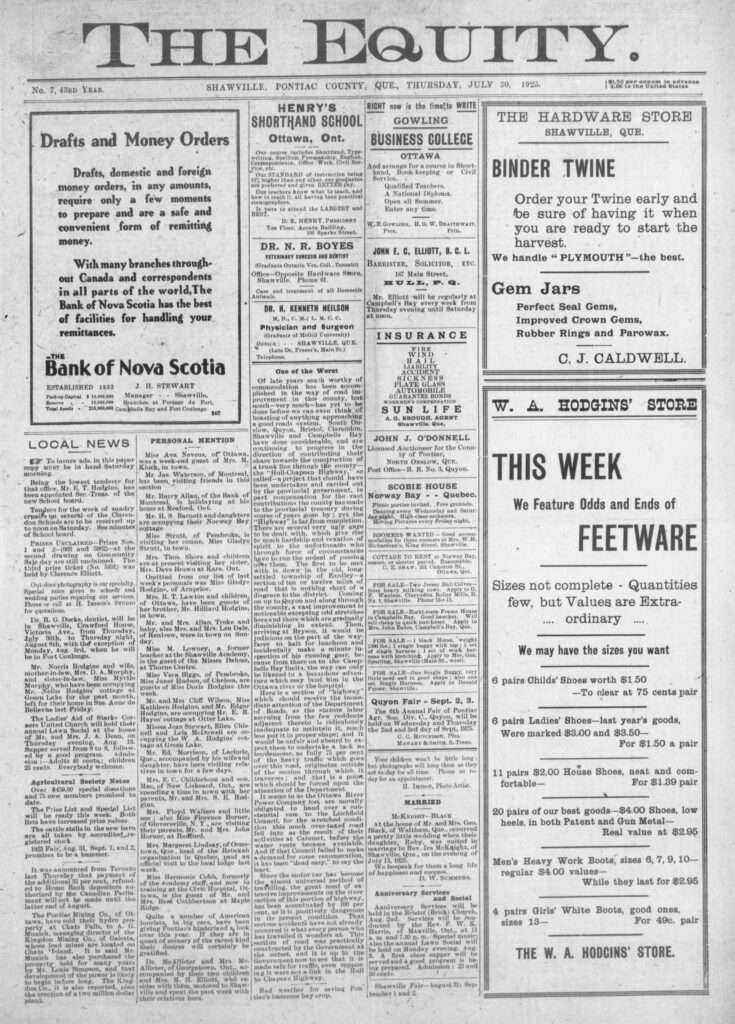 Much worthy of commendation has been accomplished in the way of road improvement in this county, but much has yet to be done before we can even think of boasting of anything approaching a good roads system. South Onslow, Quyon, Bristol, Clarendon, Shawville and Campbell’s Bay have done considerable and are continuing to progress in the direction of contributing their share towards the construction of a trunk line through the county, the “Hull-Chapeau Highway” so-called.
