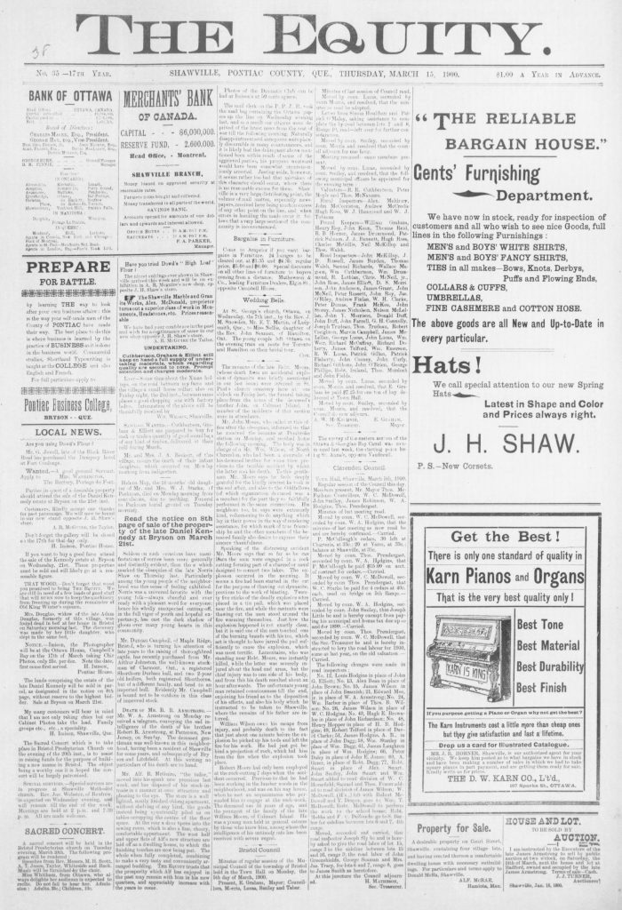 A distressing accident occurred about 30 miles south of Sudbury, when a local man was killed. The men were engaged in a rock cutting forming part of a chanel designed to connect two lakes. The explosion occurred when a fire had been started in the cut for the purpose of thawing out dynamite previous to the work of blasting. Twenty-five sticks of the explosive were placed in a tin pail which was placed near the fire, and while the contents were thawing out, the men stood around the fire warming themselves. Just how the explosion happened is not exactly clear, but it is said one of the men touched one of the burning brands with his toe, which act is thought to have jarred the pail sufficiently to cause the explosion, which was most terrific. Lamontaine, who was near another man, was instantly killed, while the latter was severely injured and death resulted an hour afterwards.